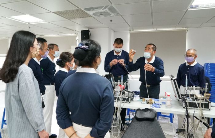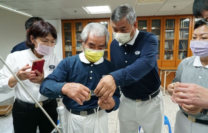 解說完畢後,讓大家模擬義診的現場,親自體驗操作牙科器具,學員分成兩組,一組先到準備區認識器械,一組學習管線的包膜。