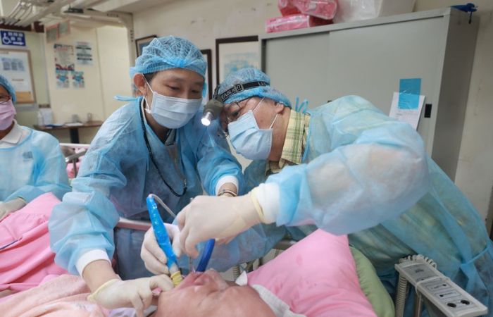 從土城診所來的牙科助理張紋翠第一次來創世幫院民洗牙。她表示:「院民無法到診所求診向醫生訴說病情,我們來幫他們洗牙,降低口腔內的細菌,防止感染,是非常有意義的事情。院民不安時握住病人的手,摸摸他,用聲音動作去安撫他們,告訴他不要緊張,其實他們是聽得懂的,只是沒有辦法表達。」