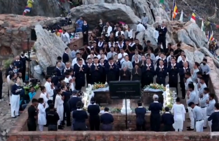 臺灣時間5月2日上午7點,佛陀2500多年前在印度說法的靈鷲山上,慈濟印度志工、馬來西亞志工與靜思精舍清修士林靜憪等與花蓮靜思精舍同步連線,以〈靈鷲山上〉手語演繹,祝願慈濟大愛恆長綿久。(圖:慈濟基金會)
