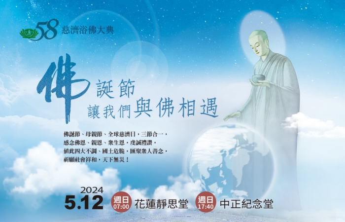 佛誕節、母親節、慈濟日,三節合一,5月12日上午7點慈濟浴佛大典,將從花蓮靜思堂道侶廣場揭開序幕,海內外慈濟會所接續舉行,全球48個國家地區也將連線參與浴佛大典,由證嚴上人與靜思精舍僧團法師帶領大眾禮敬諸佛、祈願天下無災無難、遠離兵厄,凝聚眾人虔誠善念共振的力量,上達諸佛聽。
