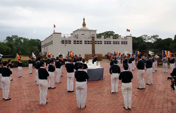5月12日上午清晨慈濟志工在尼泊爾藍毘尼-摩耶夫人寺的阿育王柱廣場前與花蓮慈濟靜思堂同步浴佛。(圖:慈濟基金會)