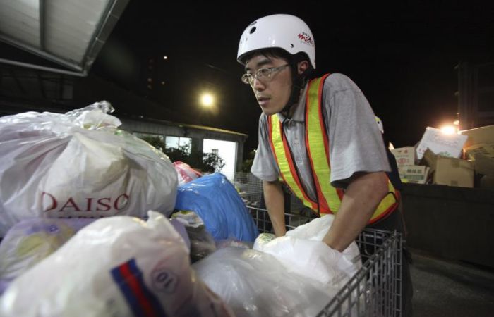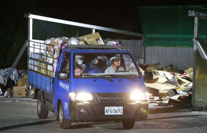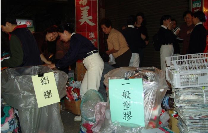 2004年,內湖開始推展夜間環保,志工與社區民眾利用騎樓,在晚上將回收物分類集中,等環保車來載走。(攝影:洪易辰)