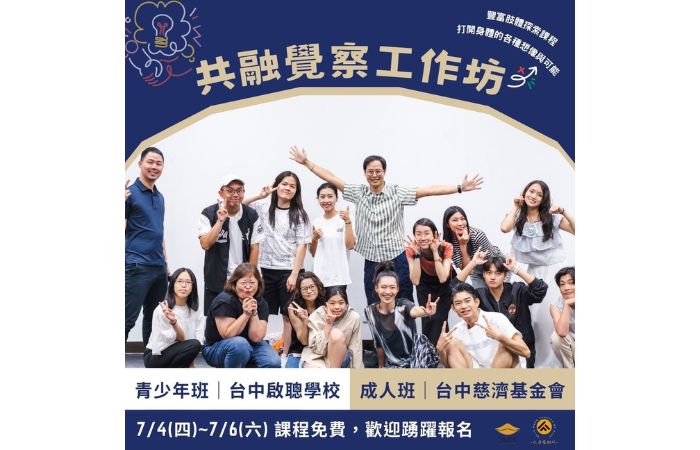 大可創藝x众月藝創所推出最新的-共融覺察工作坊7月4日至7月6日將在臺中靜思堂舉辦,這是聽障、聾人、聽人都可以前來體驗的課程!讓你不畏身分條件,都有接觸藝術文化的機會。