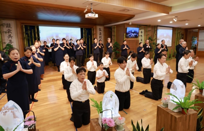 《祈禱》歌聲中,司儀引導會眾與佛對話的發好願,共祈福,會眾雙手捧心燈,默默許下心中的願望。在地球急速暖化的大環境裡,唯有人人茹素護生,將愛心普及一切眾生,才是落實真正的「普度」,祈求願願皆圓滿。