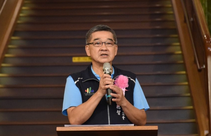 最護持慈濟的南港玉成里黃聰智里長,代表上臺致詞,服務里民十三年,受到證嚴上人的感召,讓里民自己帶環保杯來裝水,落實推動減塑活動。(攝影者:曾玉麟,地點:臺北東區聯絡處,日期:2024/7/27)