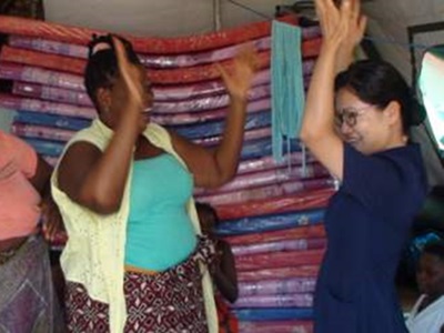 「上帝的愛真的無所不在,在地上、在身邊、在您面前、在天上,我看到了上帝的愛無所不在。」帳篷裡的歌聲自動響起,雖然蔡岱霖跟不上非洲特有的節拍,但很用心融入災民的舞蹈,一起感受他們的歡喜。她與大家分享證嚴上人說的感恩尊重愛,感恩每天醒來還活著,這群災民的感受最為深刻。